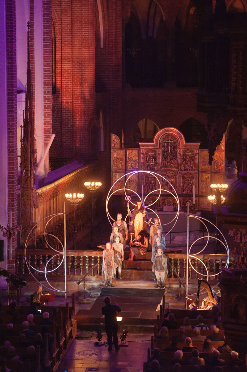 die letzten Worte der oratorischen Oper, »13 Oder til Maria« (13 Gesänge an Maria), die als eine Apotheose des Weiblichen gedacht ist, szenographisch dargestellt als das lebende Bild einer marienhaften Königin der Nacht mit den tradierten Symbolen von Kelch, Schwert, Bischofsstab, Reichsapfel, blauem Schutzmantel, Sternenwelt und